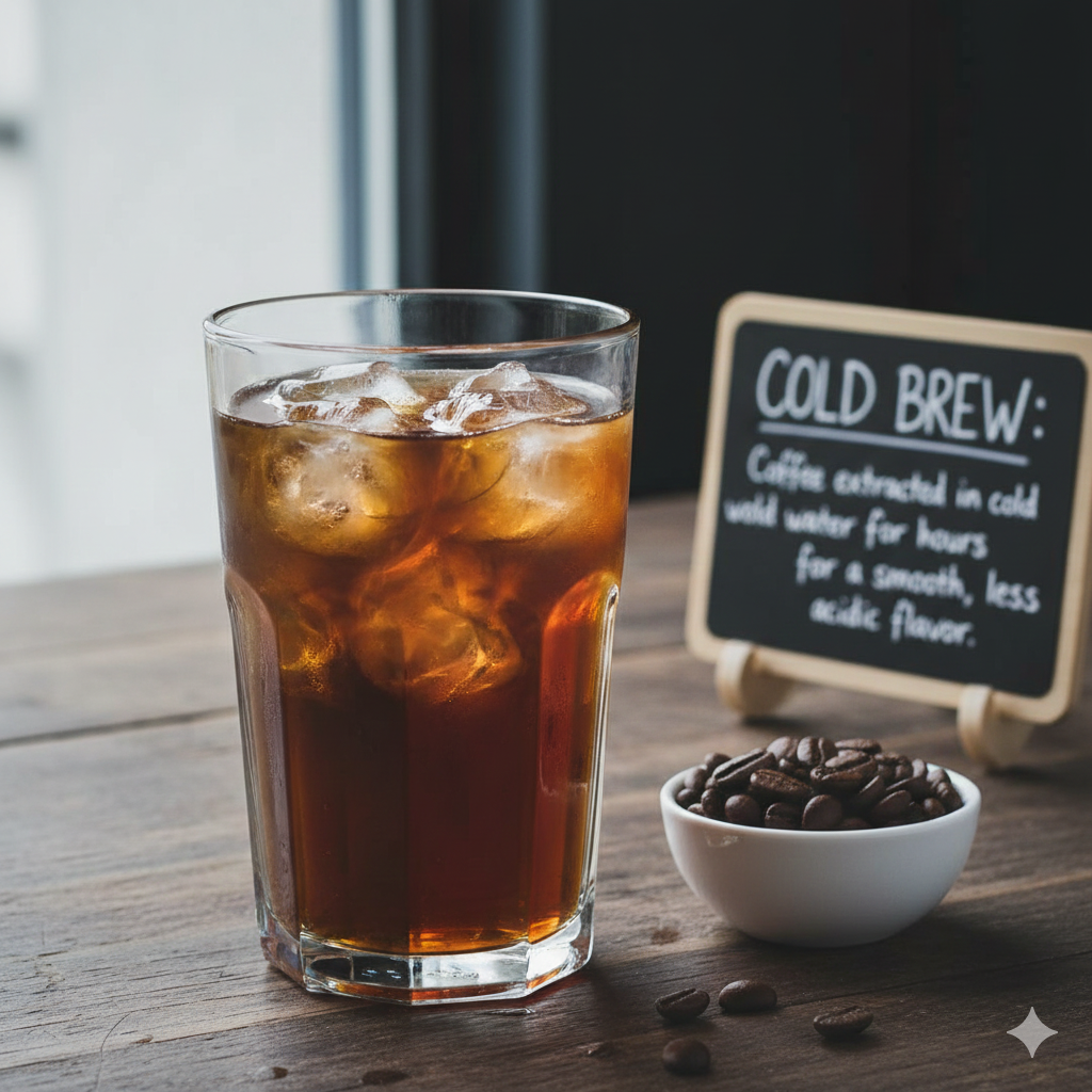 Café extraído en frío durante horas para un sabor suave y menos ácido.